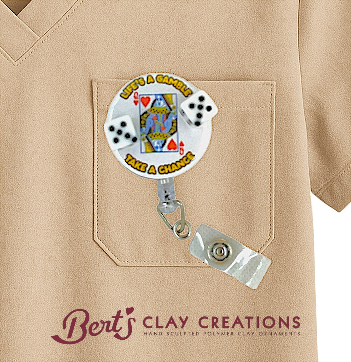 - Life’s a Gamble Badge Topper – Swappable Dice & Card ID Clip – Handmade Work Accessory – Casino Nurse Gift – Lanyard Badge Flair