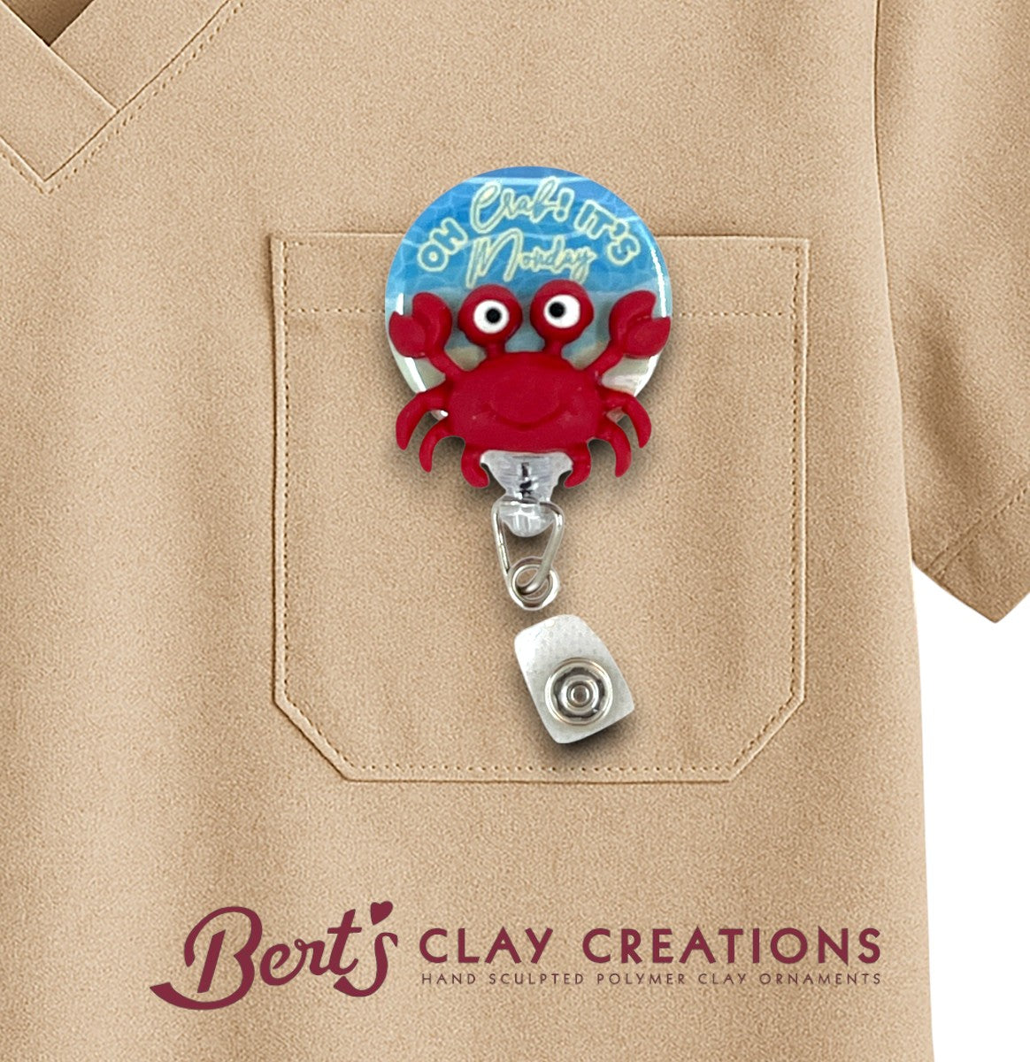 "BE HAPPY AS A CLAM" topper featuring a cheerful orange fish, a white clam shell, and colorful coral on a blue background. This fun and practical accessory is perfect for spreading positivity and charm—crafted by Bert's Badges!" * Beach and ocean lovers* Healthcare professionals* Resort/hospitality staff* Coastal workplace employees* Anyone want...
