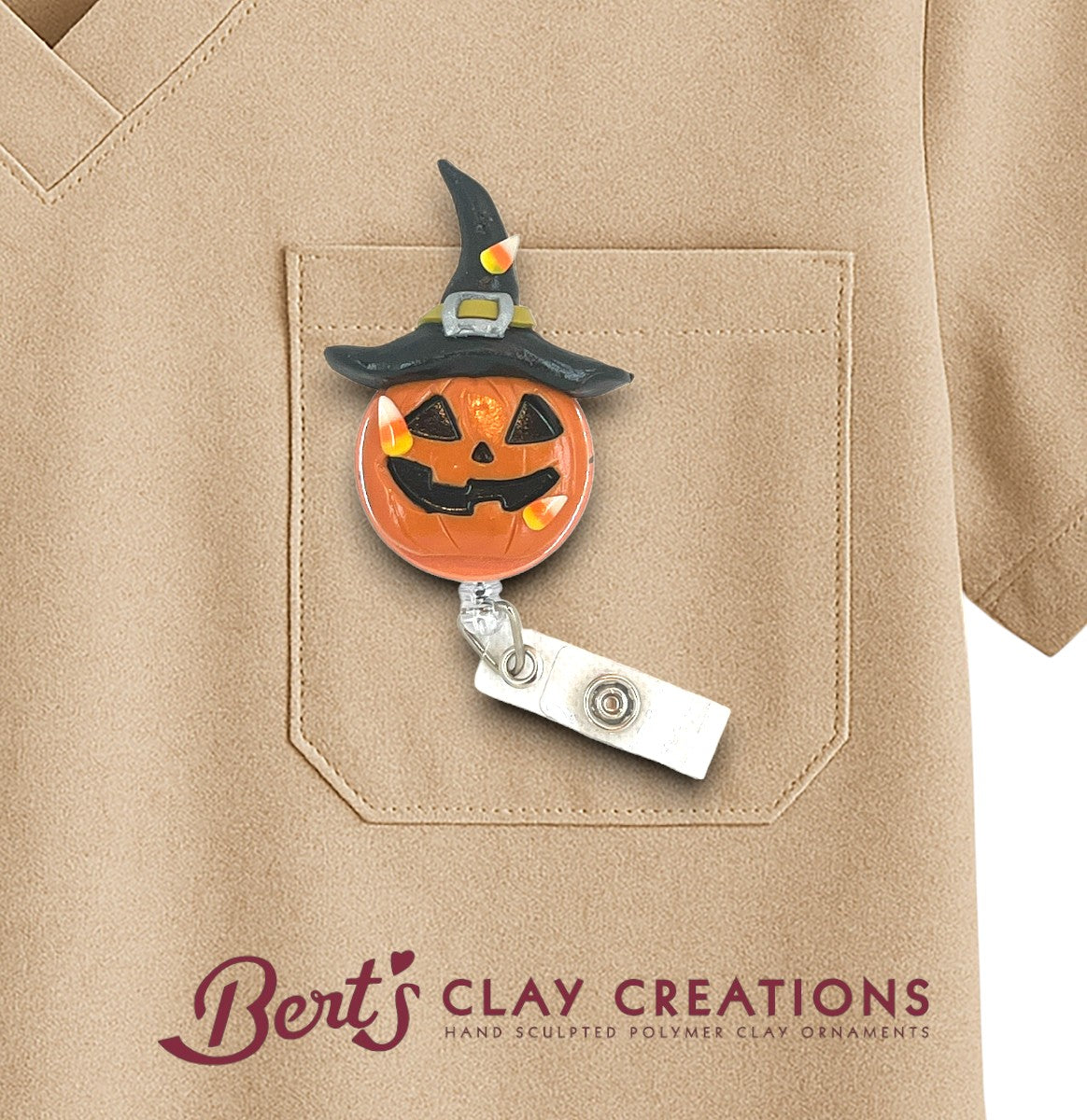 - Witchy Workday Pumpkin – Halloween Badge Reel with Candy Corn Charm